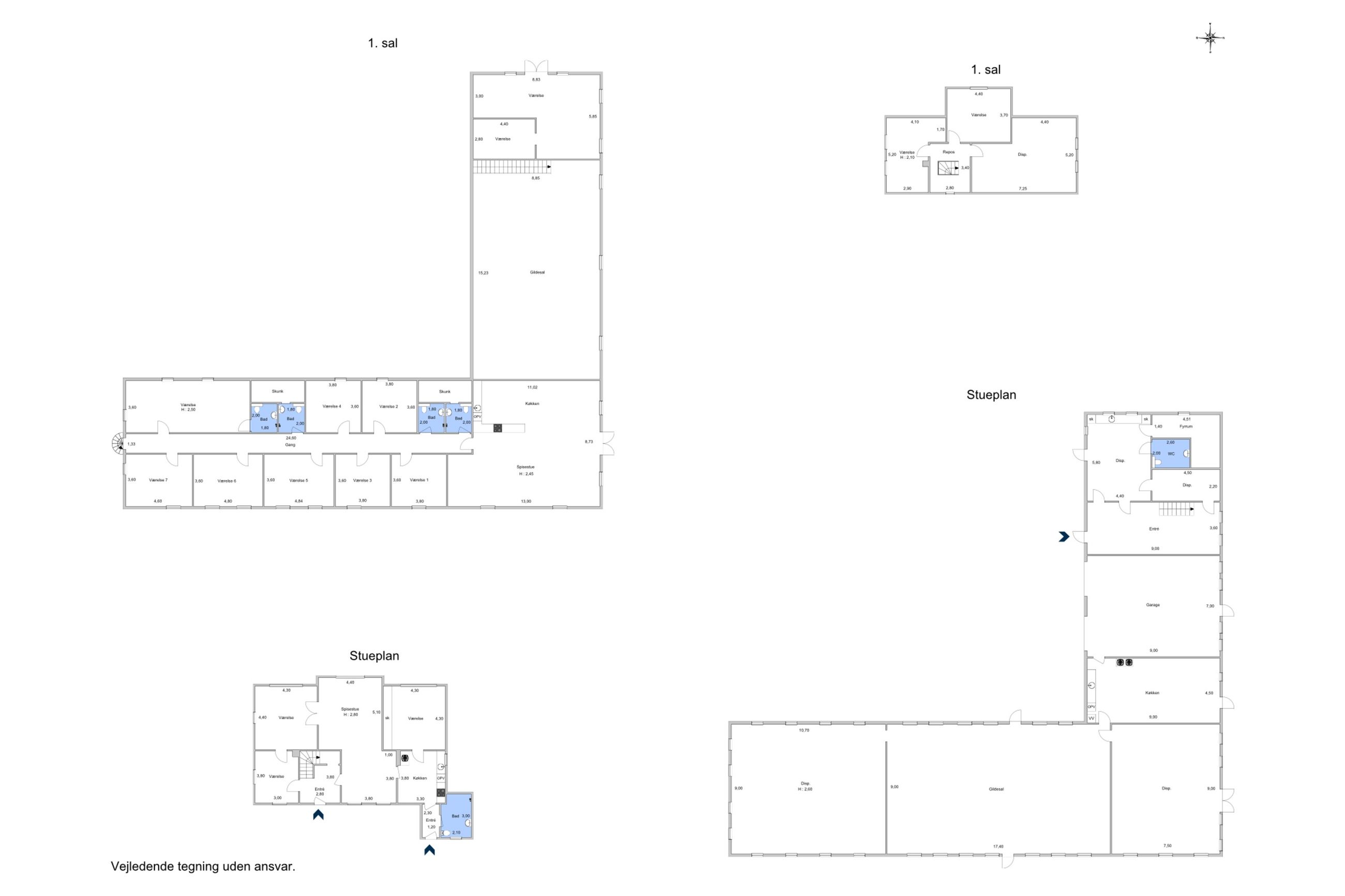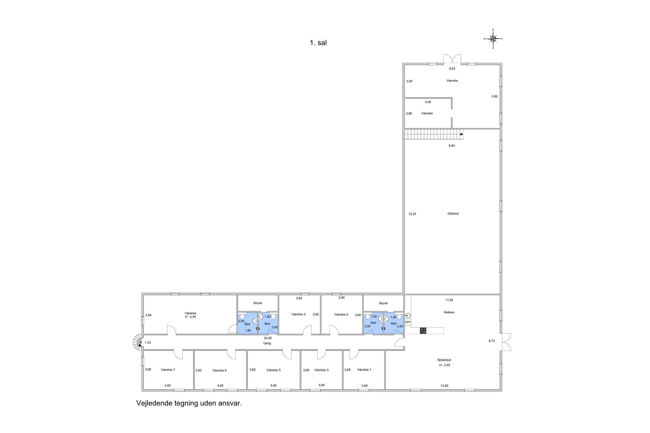 Fra køkkenet kommer du direkte ind på værelsesgangen – her er der 8 lækre værelser. Værelserne er indrettet som hotelværelser med dobbeltsenge i alle værelser, 1 værelse har eget toilet og bad og til de 7 resterende er der 3 fælles badeværelser med toilet.