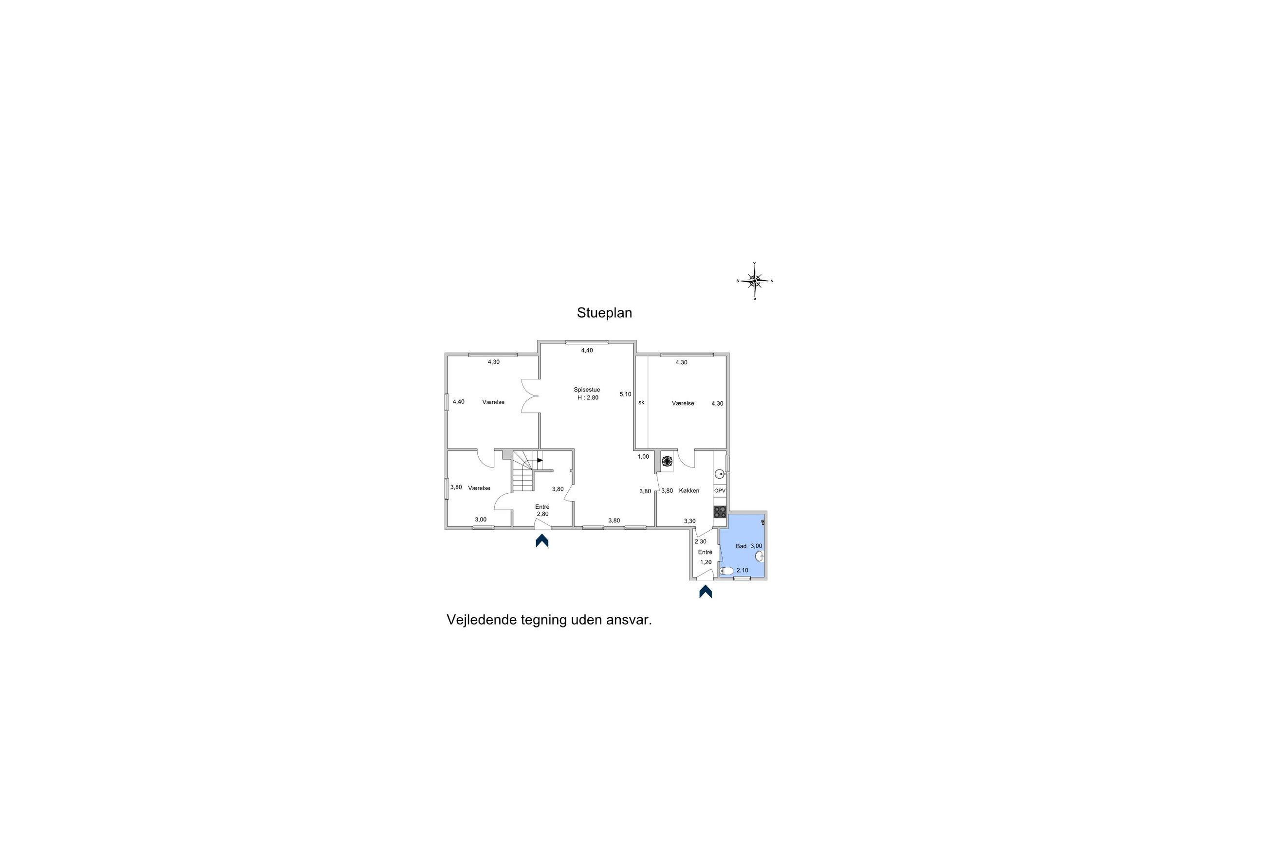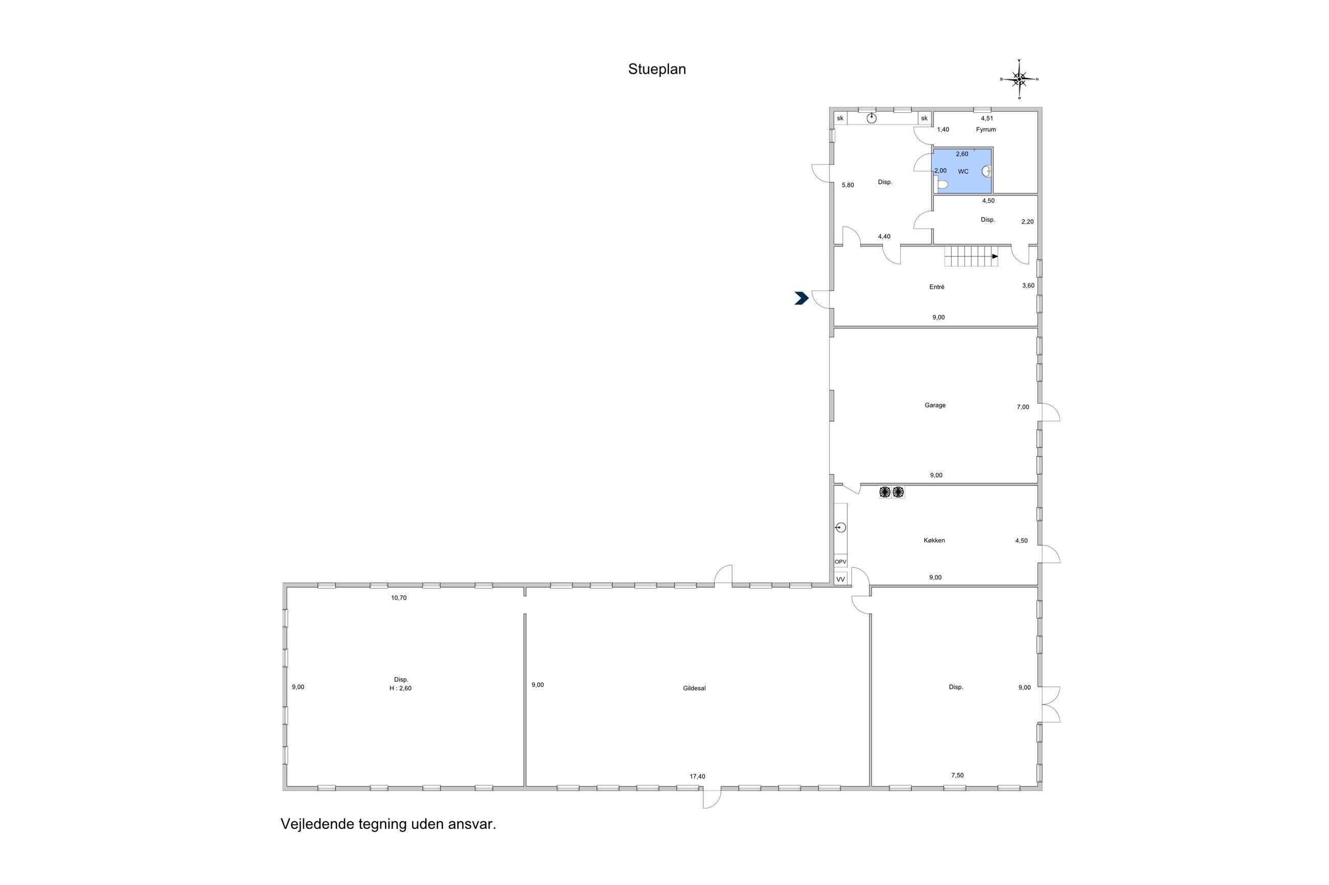 I stueplan finder du entre med trappe til 1. sal., adgang til stort bryggers med vaskemaskine og tørretumbler, stålbord med håndvask, højskabe samt toilet og stort fadebur.