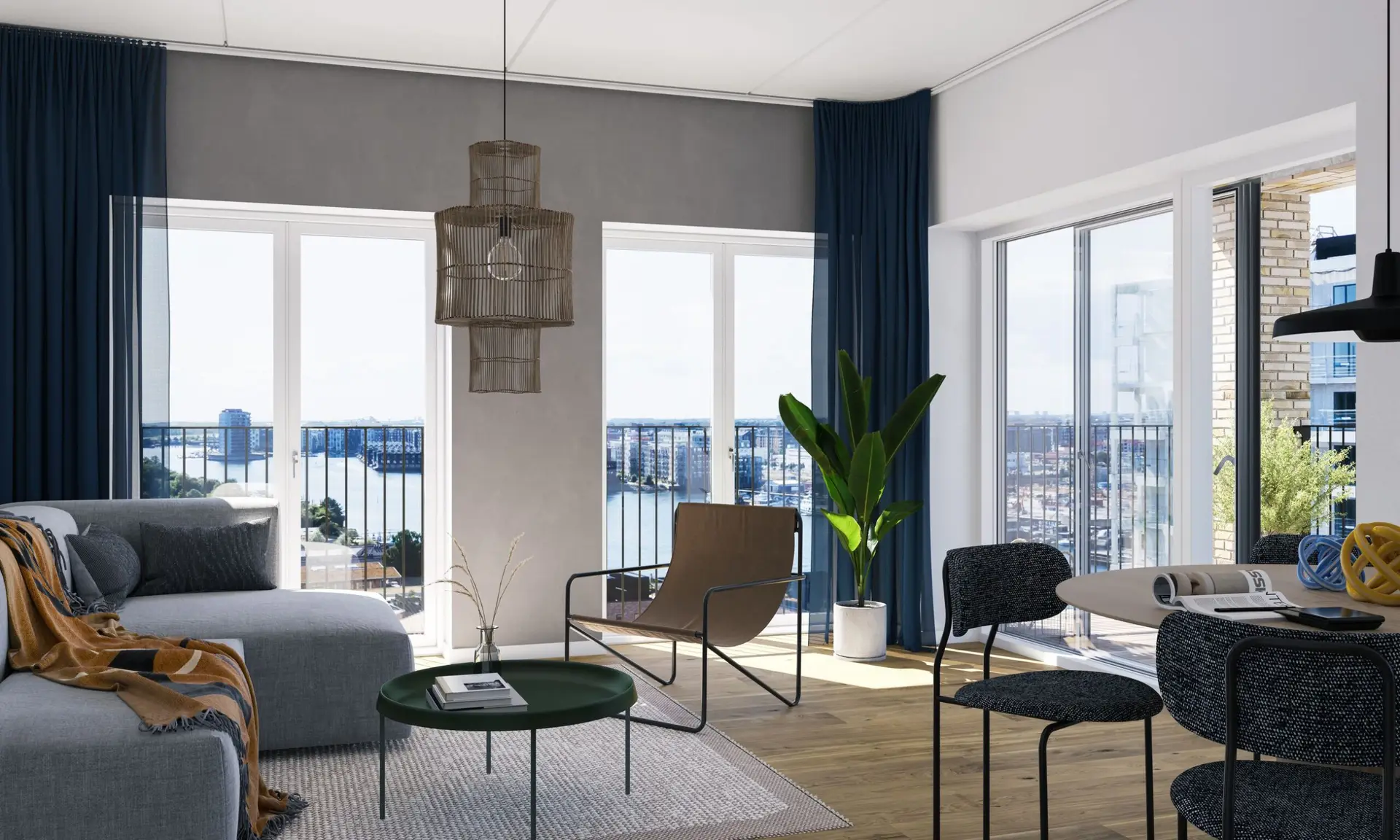 Øverst i Havnebryggen Capella ligger denne imponerende penthouselejlighed på 120 m², hvor udsigt, lys og arkitektonisk elegance smelter sammen i en boligoplevelse ud over det sædvanlige. Her får du en sjælden kombination af privatliv, panorama og gennemført kvalitet – alt sammen i første række til byens mest levende havnemiljø. Billederne er visualiseringer og kan afvige fra den konkrete lejlighed.