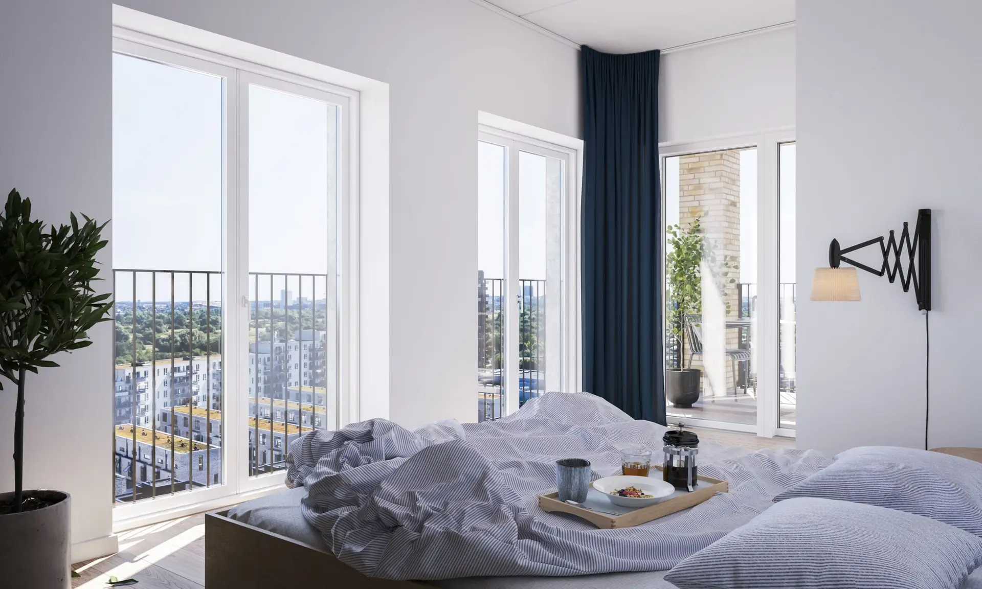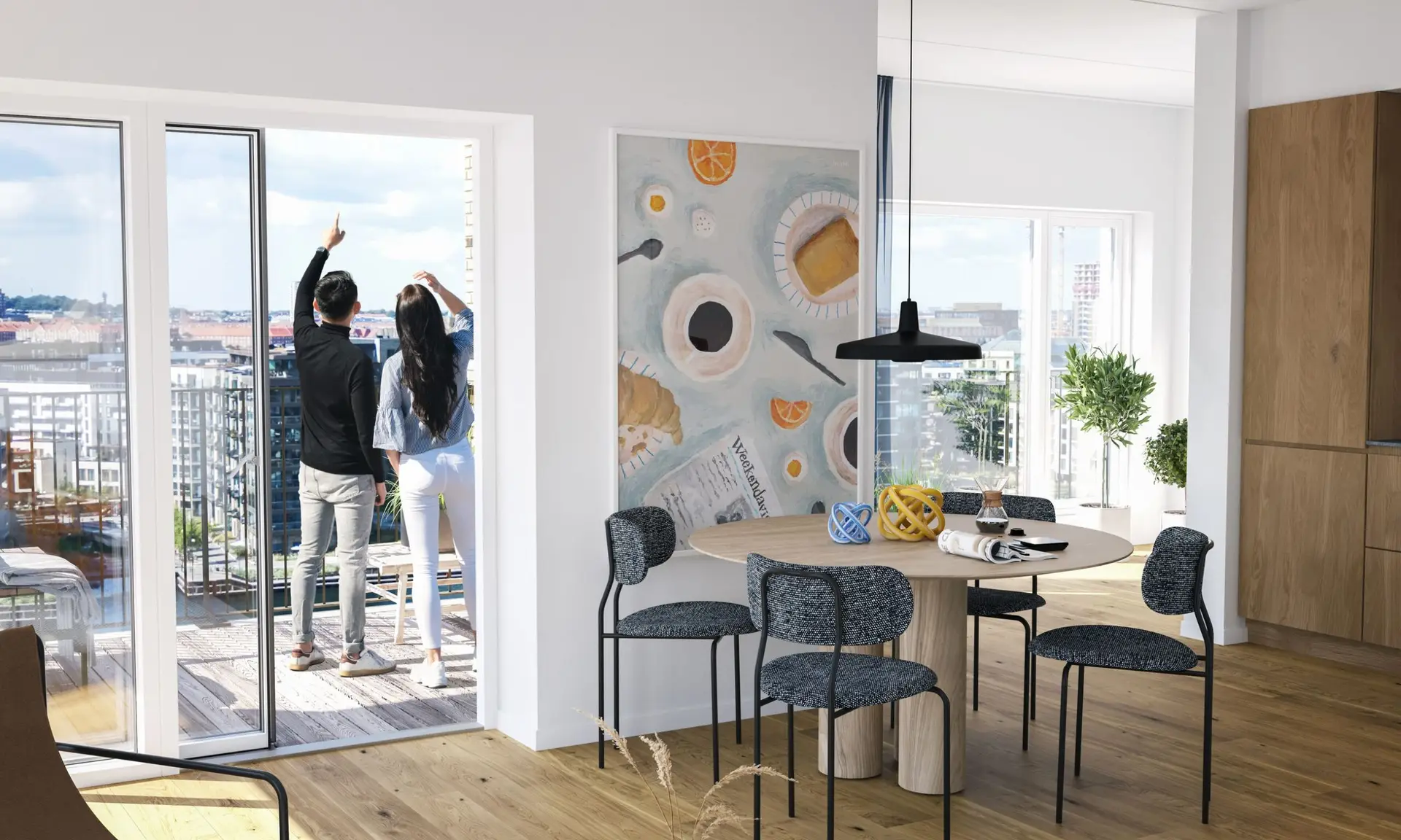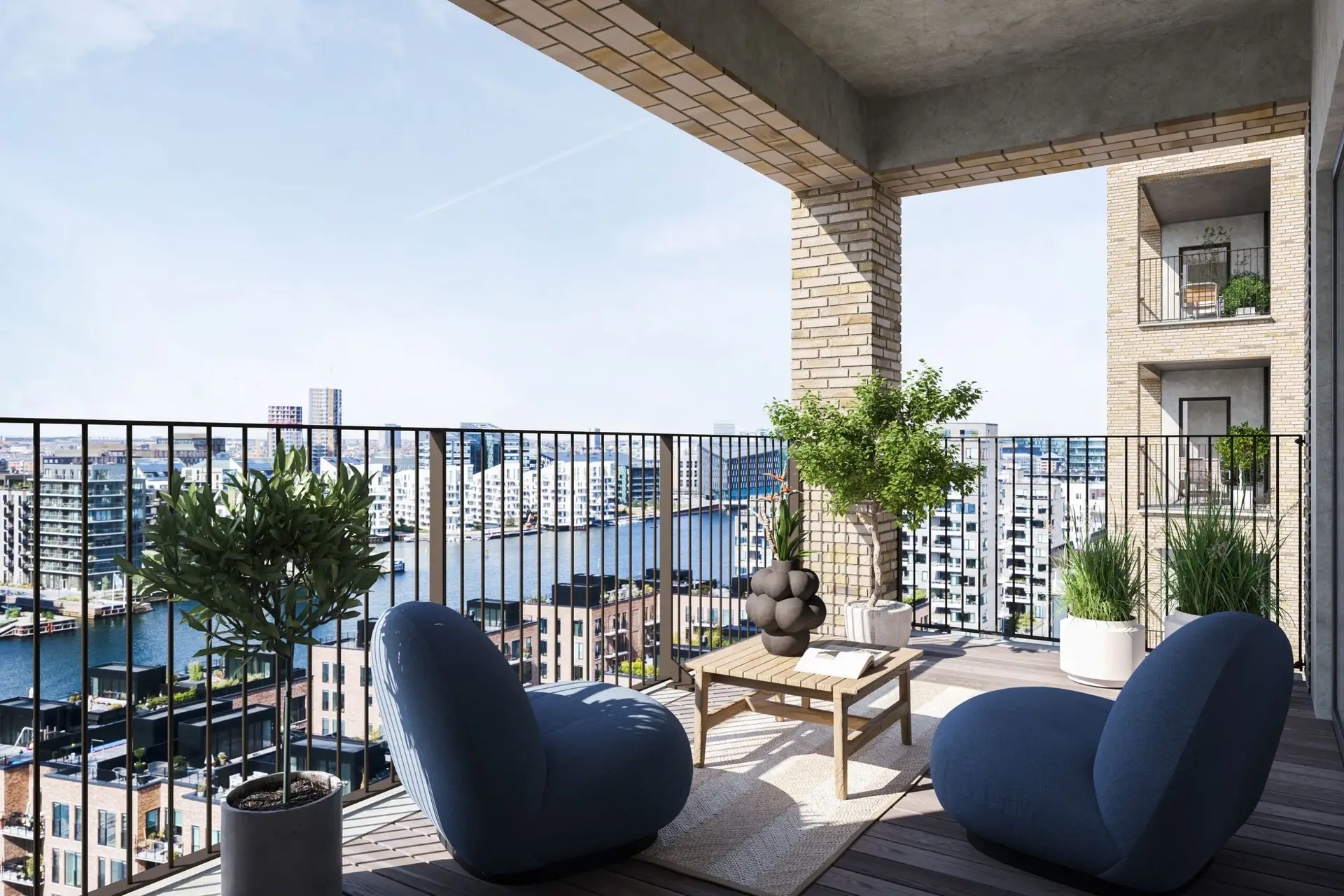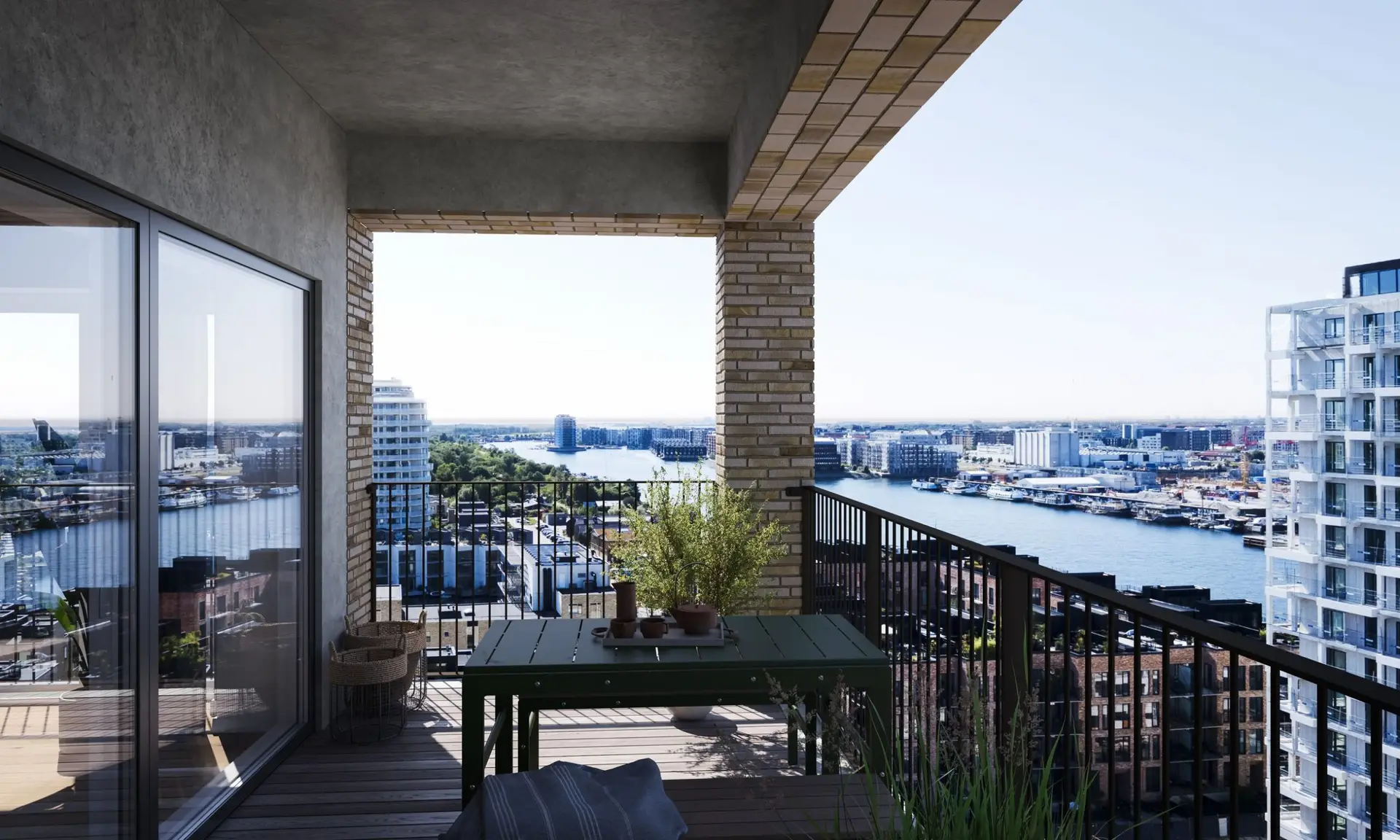 Fra opholdsrummet er der adgang til en generøs altan/terrasse, hvor du kan nyde solen, udsigten og den særlige ro, der kun findes helt øverst i bygningen. Herfra opleves havnen, himlen og byens puls i ét samlet panorama.