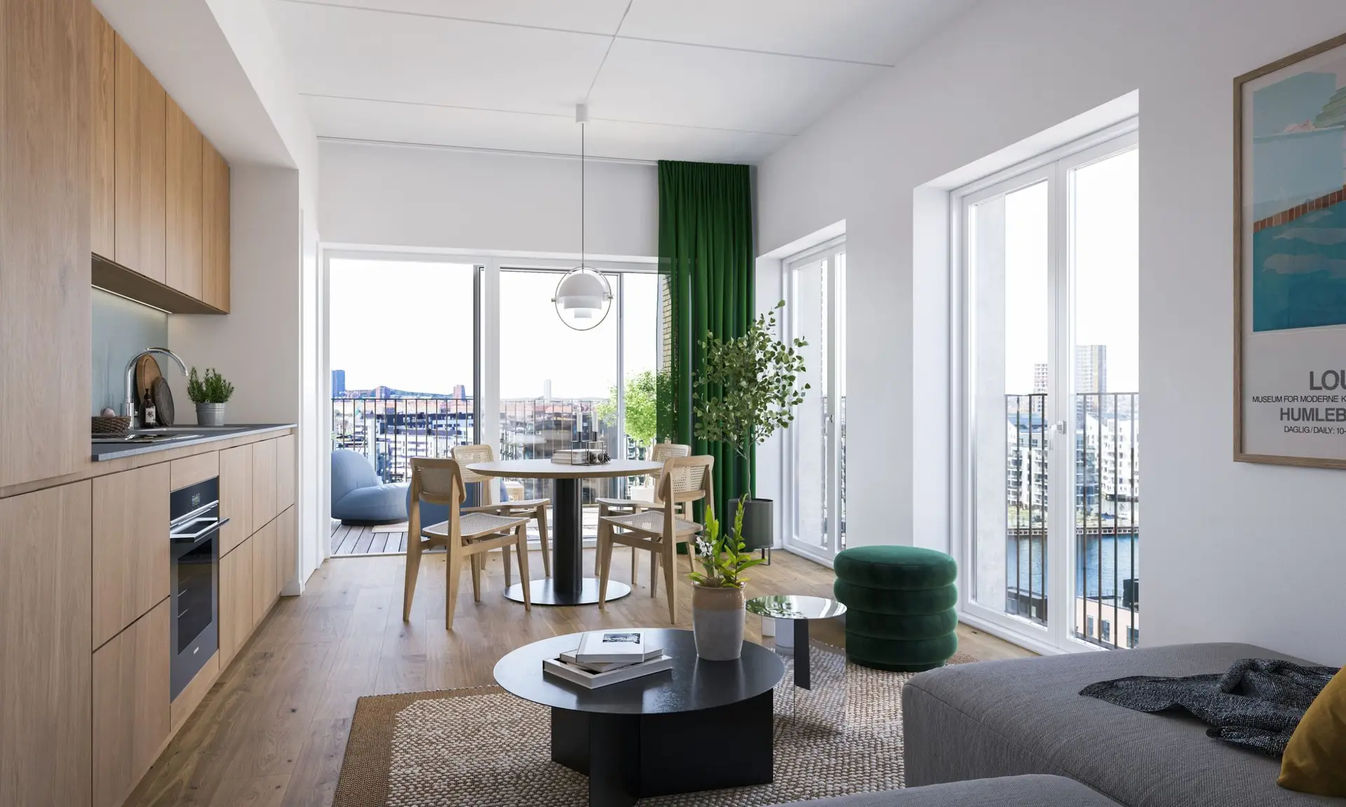 Lejligheden åbner sig med et stort, åbent opholdsrum, hvor loftshøjden, de brede glaspartier og den frie udsigt skaber en næsten svævende fornemmelse. Køkkenet er integreret som en naturlig del af rummet og udført i eksklusive materialer, der understreger boligens moderne og stilrene udtryk.