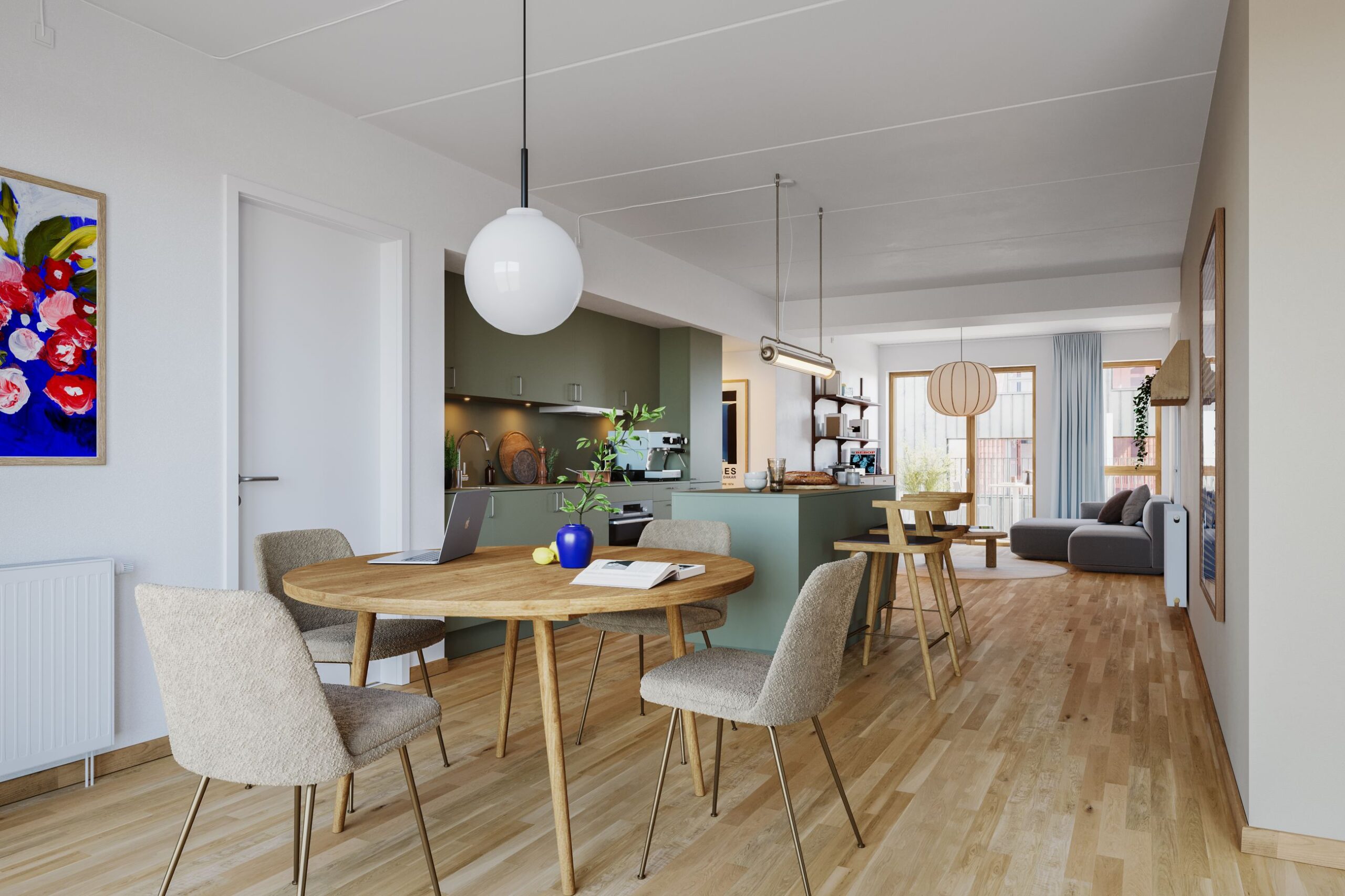 Denne rummelige 4-værelses lejlighed er skabt til familien, der ønsker både komfort, kvalitet og nærhed til natur og by. Her får du en bolig med store opholdsrum og en atmosfære, der indbyder til både hverdagsliv og gæster.