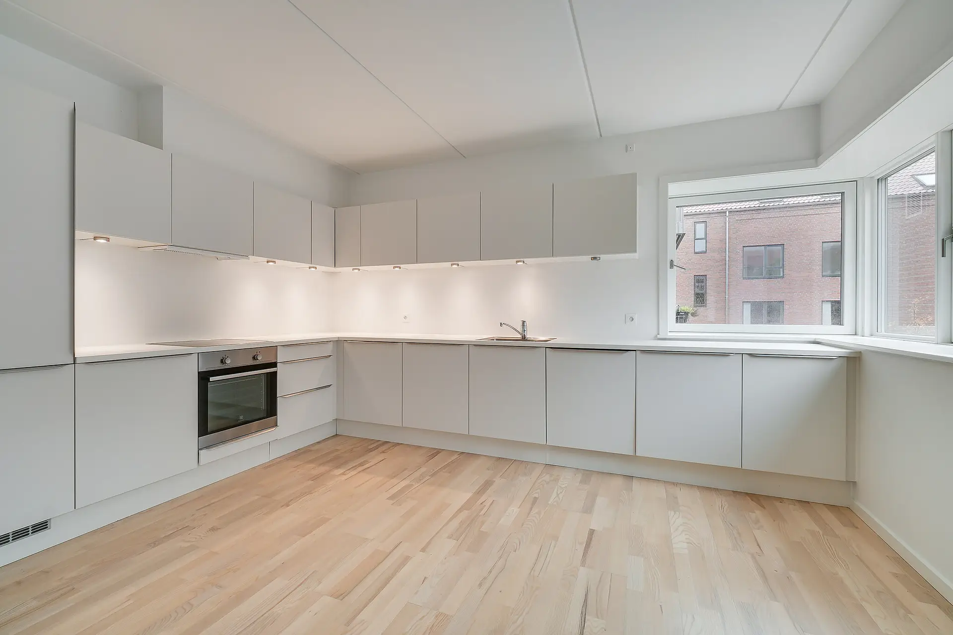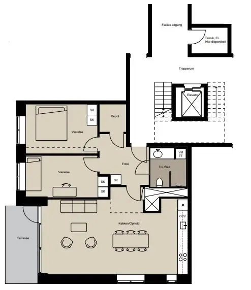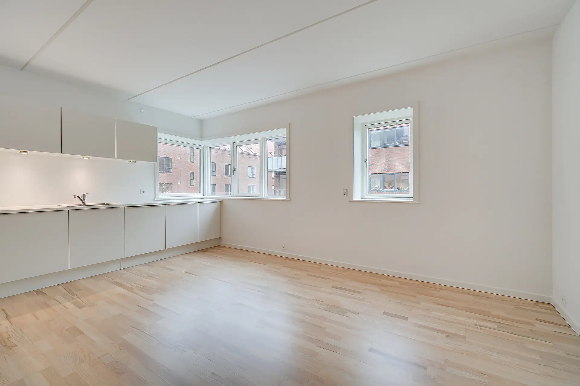 Når du træder ind i vores lejeboliger, vil du opleve et vidunderligt lysindfald fra de store vinduespartier, der skaber lyse og indbydende rum, som du har lyst til at opholde dig i. Hovedfokuset er det store køkkenalrum og stue i ét, og udover det er alle boliger designet med velindrettede værelser, rummelige badeværelser med vaskemaskine og et mindre depotrum til opbevaring eller måske endda en walk-in-closet.