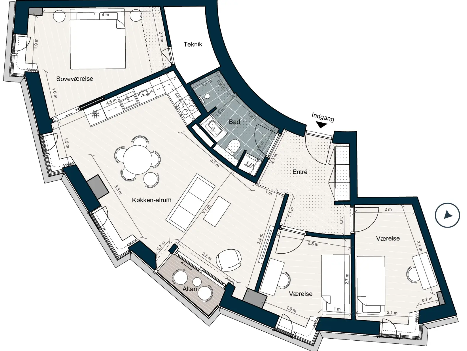 Uanset om du lejer en 2-værelses eller en 7-værelses bolig i Postbyen, kommer du til at leve i et unikt og utraditionelt hjem, der byder på alt andet end kvadratiske rum. De cirkelrunde boligtårne skaber nemlig vinkler, snit og hjørner, hvor man hver dag kan glædes over at bo i et hjem, hvor vægge, gulve og lofter ikke følger den traditionelle vinkeltrekant.