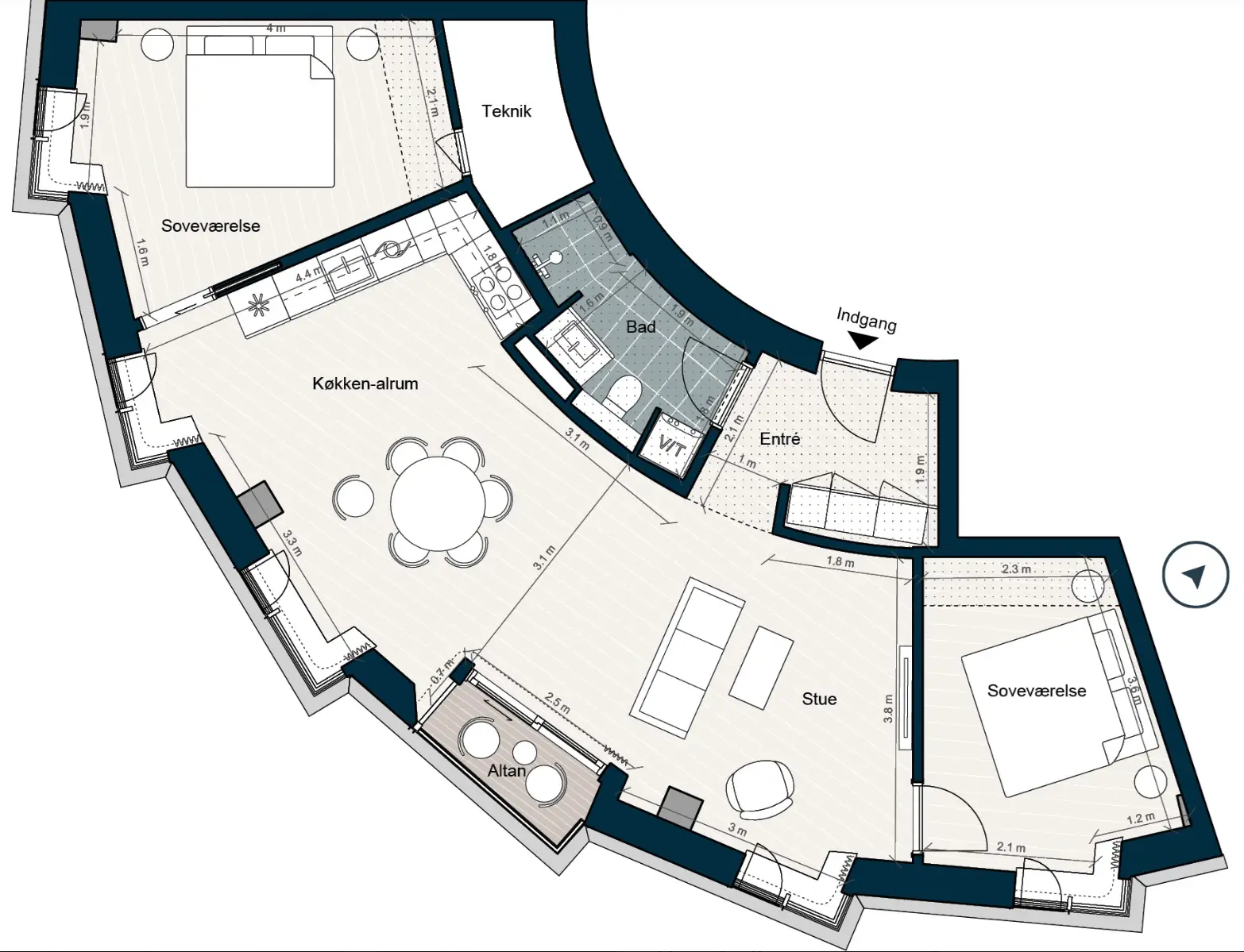Uanset om du lejer en 2-værelses eller en 7-værelses bolig i Postbyen, kommer du til at leve i et unikt og utraditionelt hjem, der byder på alt andet end kvadratiske rum. De cirkelrunde boligtårne skaber nemlig vinkler, snit og hjørner, hvor man hver dag kan glædes over at bo i et hjem, hvor vægge, gulve og lofter ikke følger den traditionelle vinkeltrekant.