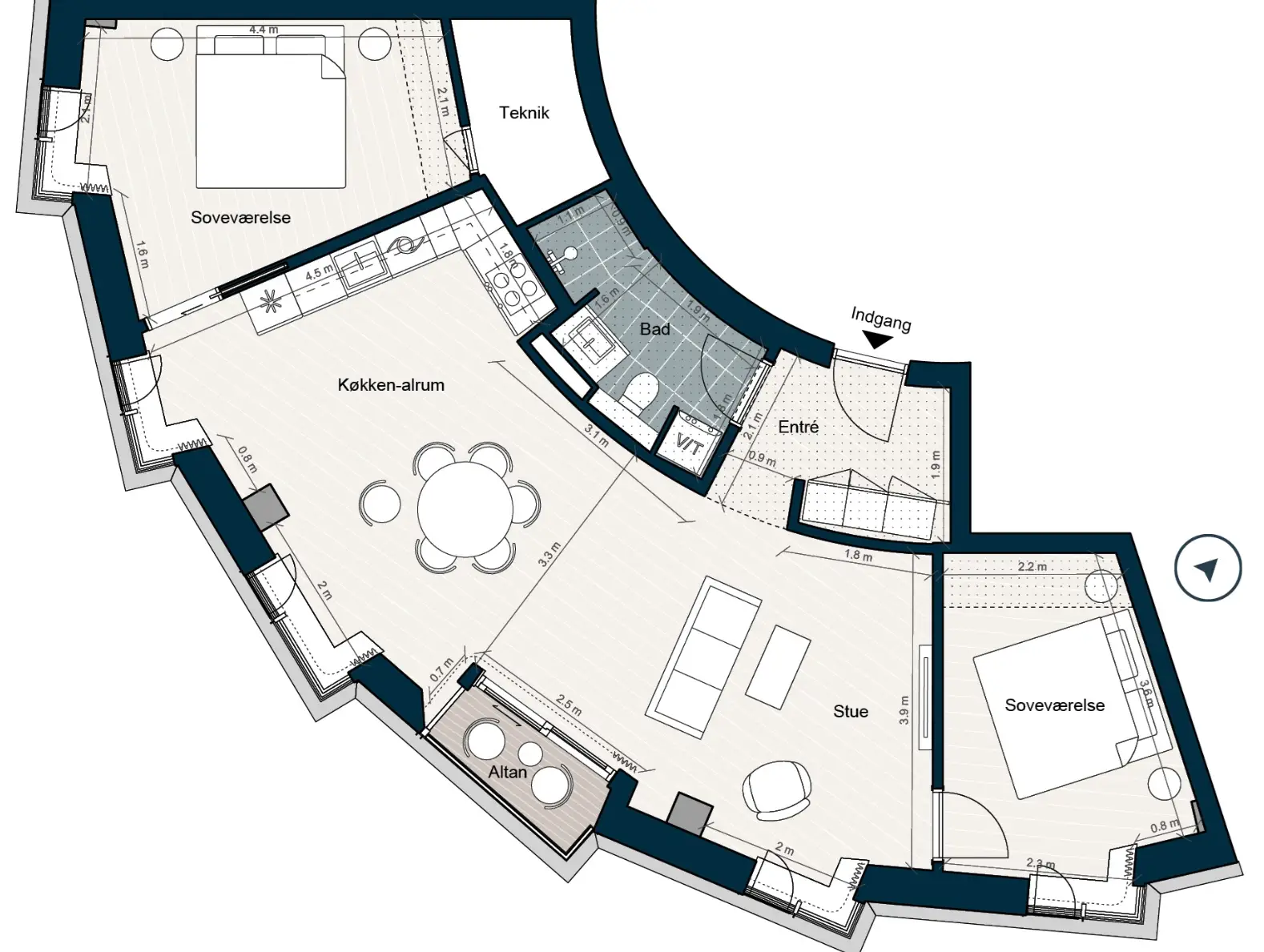 Uanset om du lejer en 2-værelses eller en 7-værelses bolig i Postbyen, kommer du til at leve i et unikt og utraditionelt hjem, der byder på alt andet end kvadratiske rum. De cirkelrunde boligtårne skaber nemlig vinkler, snit og hjørner, hvor man hver dag kan glædes over at bo i et hjem, hvor vægge, gulve og lofter ikke følger den traditionelle vinkeltrekant.